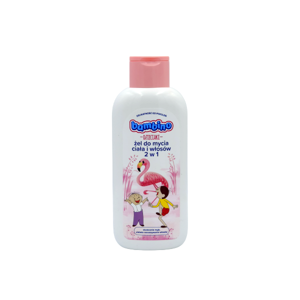 Bambino Żel do mycia ciała i włosów 2w1. Produkt skutecznie myje skórę i włosy nadając im miękkości. Ułatwia rozczesywanie włosów, delikatnie się pieni i łatwo spłukuje. Nie podrażnia oczu i nie powoduje łzawienia. Ma pH przyjazne dla skóry. Do stosowania u dzieci powyżej 1 roku życia. Żel 2 w 1 zarówno chroni skórę przed wysuszeniem i myje włosy, pozostawiając je czyste i miękkie.