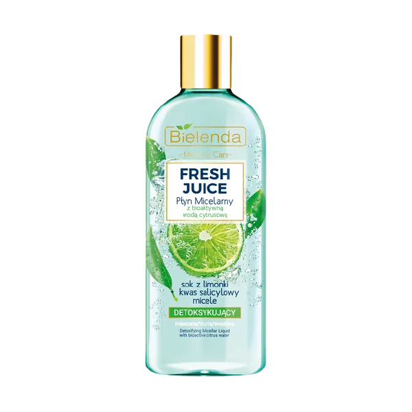 Bielenda Płyn Micelarny z BIOAKTYWNĄ WODĄ CYTRUSOWĄ zawiera detoksykujący SOK Z LIMONKI, antybakteryjny KWAS SALICYLOWY oraz oczyszczające MICELE.