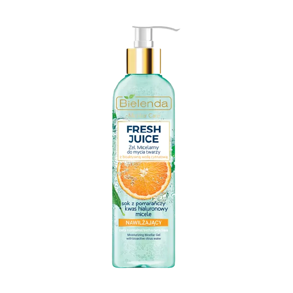 Bielenda Żel Micelarny do mycia twarzy z BIOAKTYWNĄ WODĄ CYTRUSOWĄ zawiera odświeżający SOK Z POMARAŃCZY, nawilżający KWAS HIALURONOWY oraz oczyszczające MICELE.