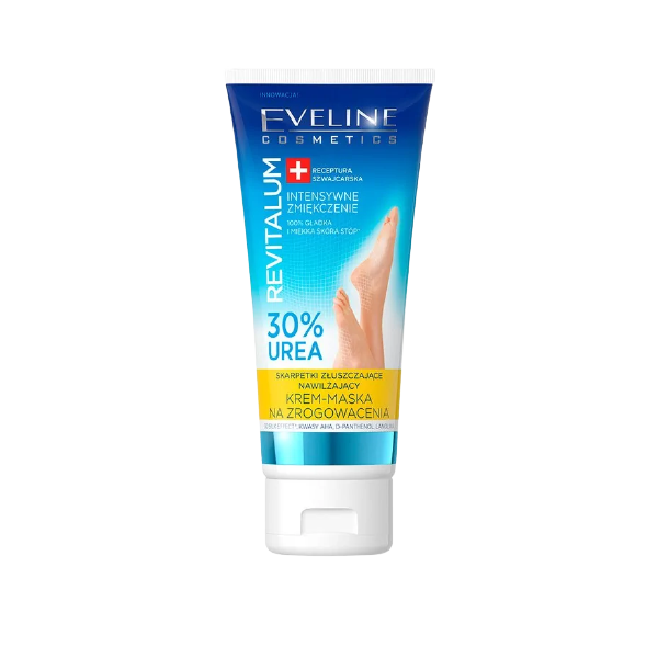 Eveline Revitalum nawilżający krem-maska na zrogowacenia z 30% zawartością UREA i lanolinie działa jak złuszczające skarpetki w kremie, skutecznie usuwając suchy, pogrubiony naskórek i stymulując jego cykl odnowy. Dzięki zawartości D-panthenolu i lipidów krem wspomaga regenerację, przywraca gładkość i aktywnie przeciwdziała przesuszeniom i pęknięciom. Już po 3 dniach stosowania skóra Twoich pięt jest bardziej wygładzona, nawilżona i zmiękczona.